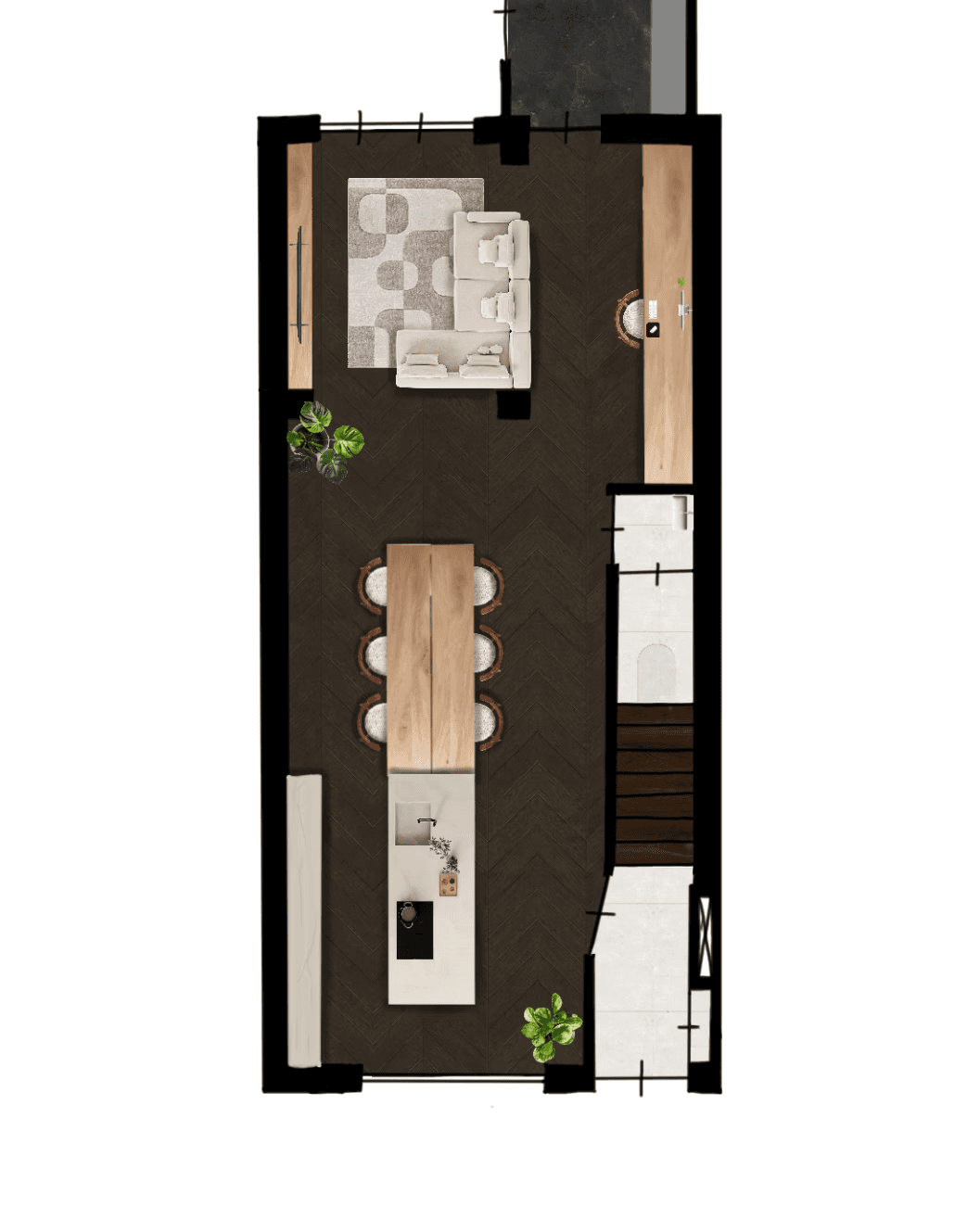 Een stijlvolle inrichting, vertaald naar de plattegrond. De gekozen sfeer en stijl worden doorvertaald in een functionele plattegrond met aandacht voor meubelplaatsing, verhoudingen, looplijnen en materialen op vloerniveau. Denk aan de juiste positie van meubels, de afstemming tussen zitgedeelte en eettafel, en bijvoorbeeld de keuze voor vloerkleden of vloerafwerkingen. Het resultaat is een realistische, doordachte plattegrond die rust en richting biedt — als sterke basis voor het verdere ontwerp van je interieur.